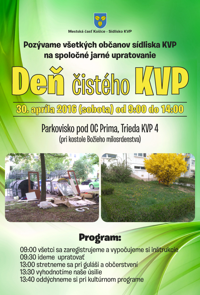 Pozývame všetkých občanov sídliska KVP na spoločné jarné upratovanie 30. apríla 2016 (sobota) od 9:00 do 14:00. Stretneme sa na parkovisku pod OC Prima, Trieda KVP 4 (pri kostole Božieho milosrdenstva).