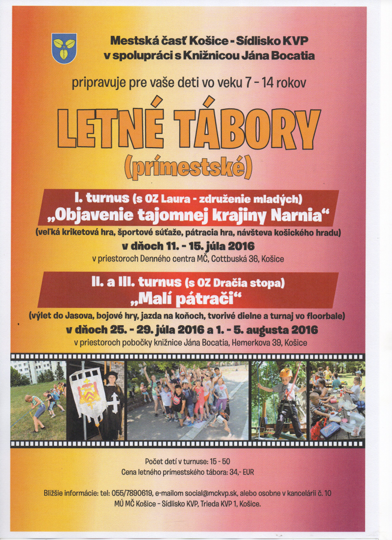 Mestská časť Košice – Sídlisko KVP v spolupráci s Knižnicou Jána Bocatia pripravuje pre vaše deti vo veku 7 – 14 rokov Letné prímestské tábory.