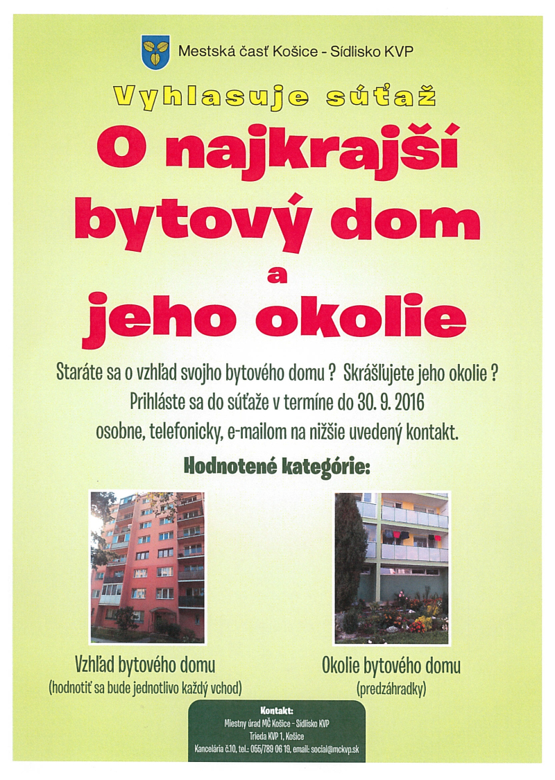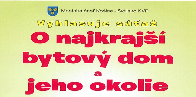 Mestská časť Košice – Sídlisko KVP vyhlasuje súťaž „O najkrajší bytový dom a jeho okolie“. Ak sa staráte o vzhľad svojho bytového domu a skrášľujete jeho okolie, prihláste do súťaže svoj vchod, alebo predzáhradku.