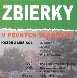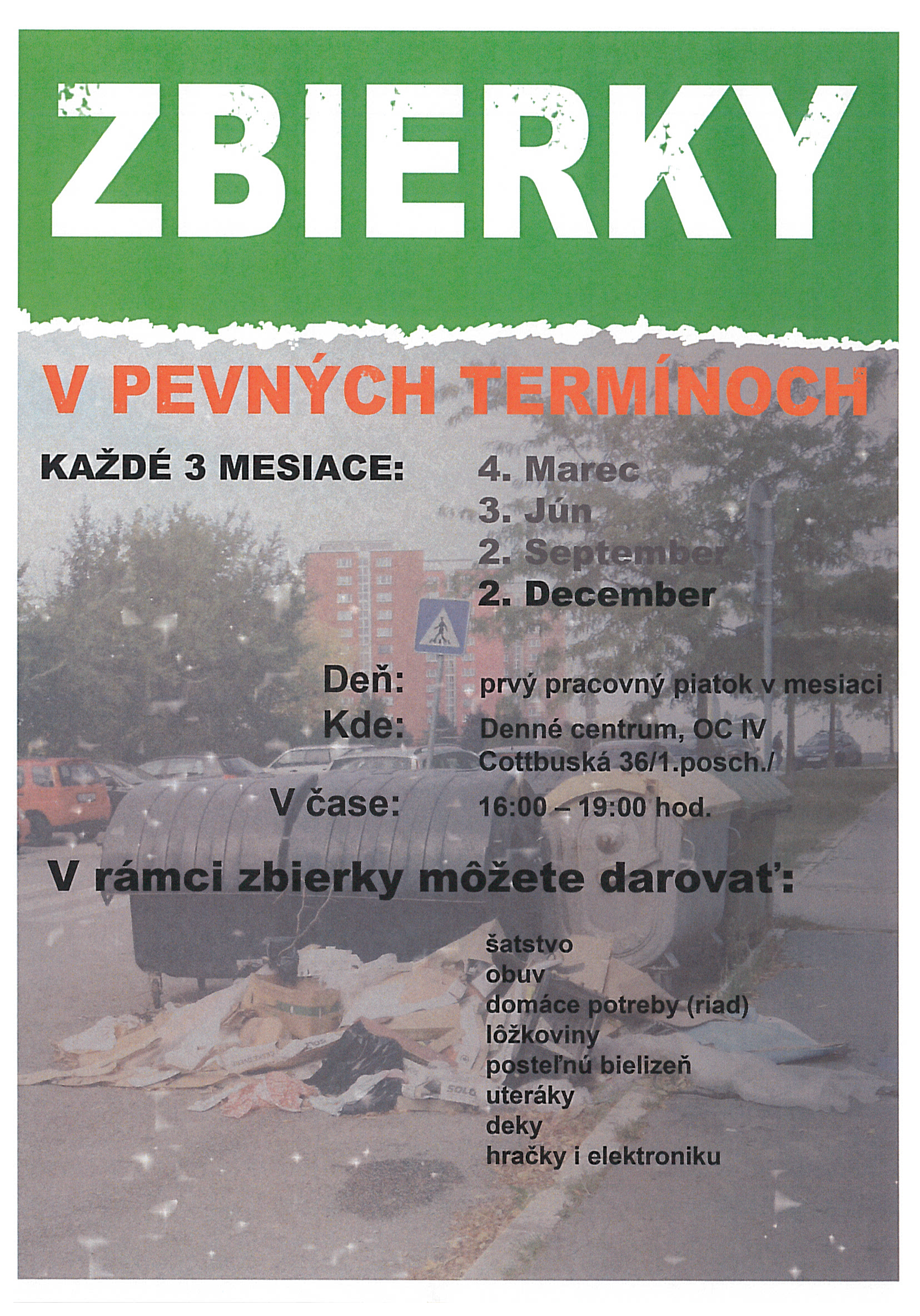 Prvý piatok v mesiaci december 02.12.2016 od 16.00 do 19.00 hod. MČ Košice – Sídlisko KVP opäť pripravila zbierku. Posledný raz v tomto roku môžete do Denného centre mestskej časti, Cottbuská 36, Košice priniesť šatstvo, obuv, domáce potreby, posteľnú bielizeň, uteráky, deky, hračky i elektroniku.