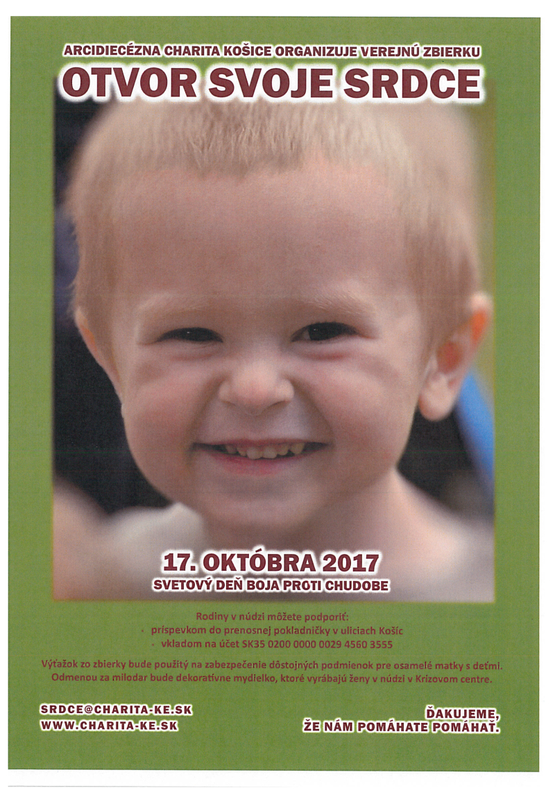 Arcidiecézna charita Košice organizuje počas Svetového dňa boja proti chudobe 17. októbra 2017 verejnú zbierku Otvor svoje srdce. Rodiny v núdzi môžete podporiť príspevkom do prenosnej pokladničky v košických uliciach, obchodných centrách, na školách, niektorých úradoch a firmách, alebo vkladom na účet SK35 0200 0000 0029 4560 3555. Výťažok zo zbierky bude použitý na zabezpečenie dôstojných podmienok pre osamelé matky s deťmi. Za príspevok dostanete odmenu - dekoratívne mydielko , ktoré vyrábajú ženy v núdzi v Krízovom centre.