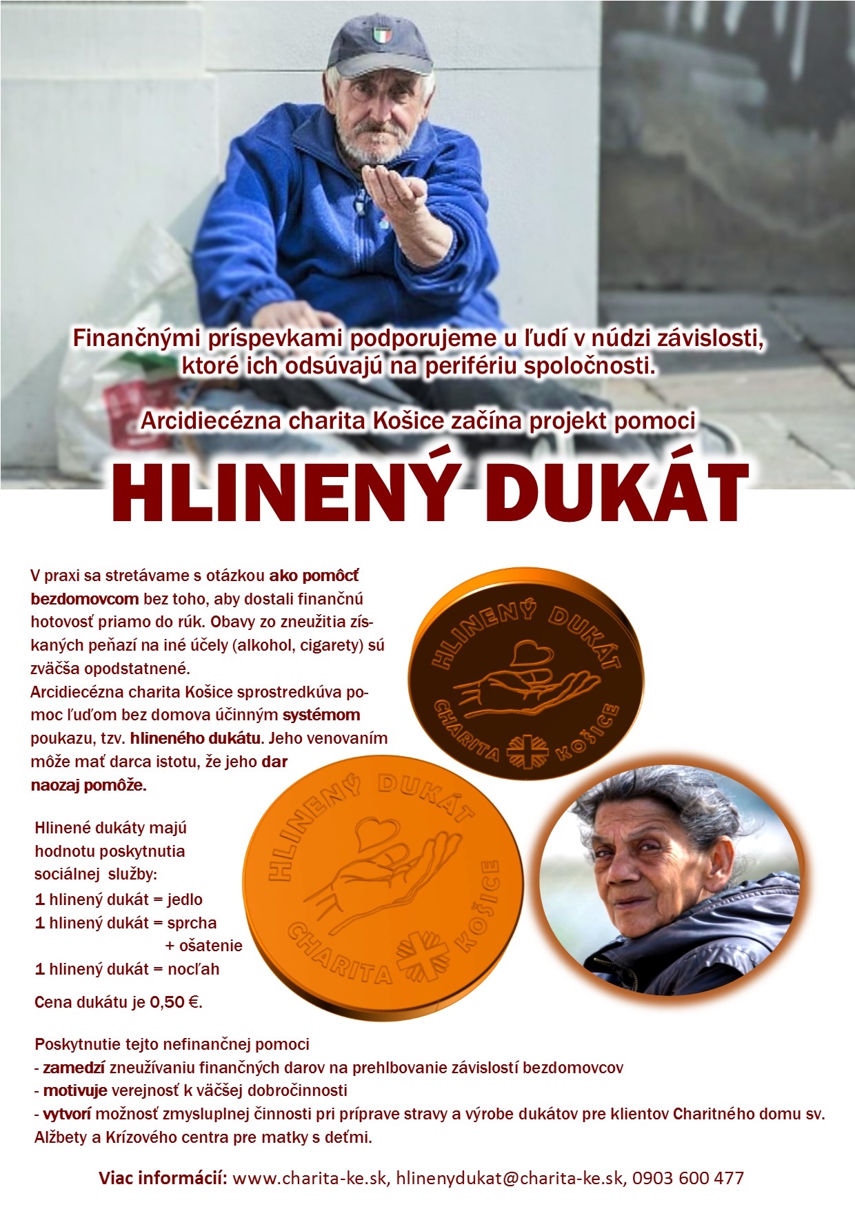 Nedávajte finančnú hotovosť bezdomovcom – zapojte sa i Vy do projektu pomoci „HLINENÝ DUKÁT“. Prostredníctvom tohto projektu môžete pomôcť ľuďom bez domova účinným spôsobom prostredníctvom poukazu, tzv. „hlineného dukátu“. Jeho venovaním môže mať darca istotu, že jeho dar naozaj pomôže a nebude zneužitý na iné účely (napr. alkohol, cigarety). Cena dukátu je 0,50 €. Hlinené dukáty môžu ľudia bez domova použiť takto: