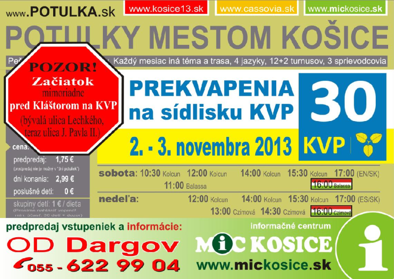 V nedeľu (5. januára) sprevádza M. Kolcun o 12:00, 14:00, 15:30 a 17:00 po slovensky. Betka Czimová začína svoje turnusy v nedeľu o 13:00 a 14:30 po slovensky a 16:00 po maďarsky. Vstupné je v predpredaji 1,75 €, v deň konania a na mieste 2,99 €. Lístky predpredáva a informácie podáva Informačné centrum MiC v OD Dargov. www.potulka.sk.