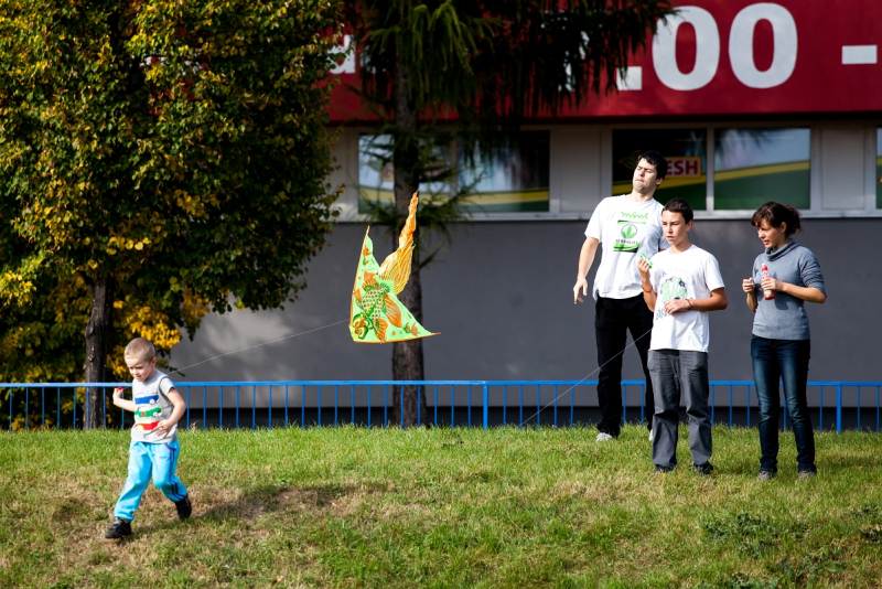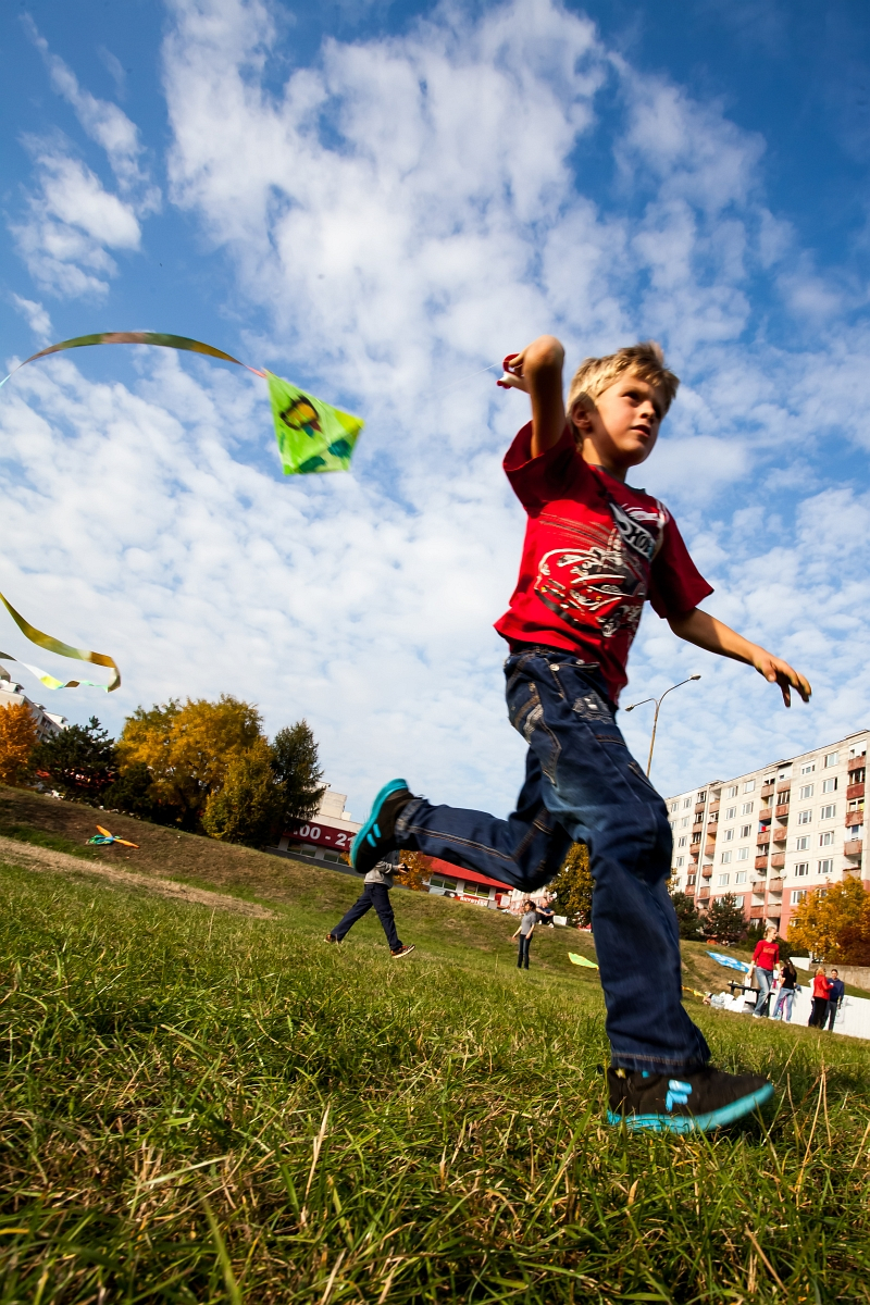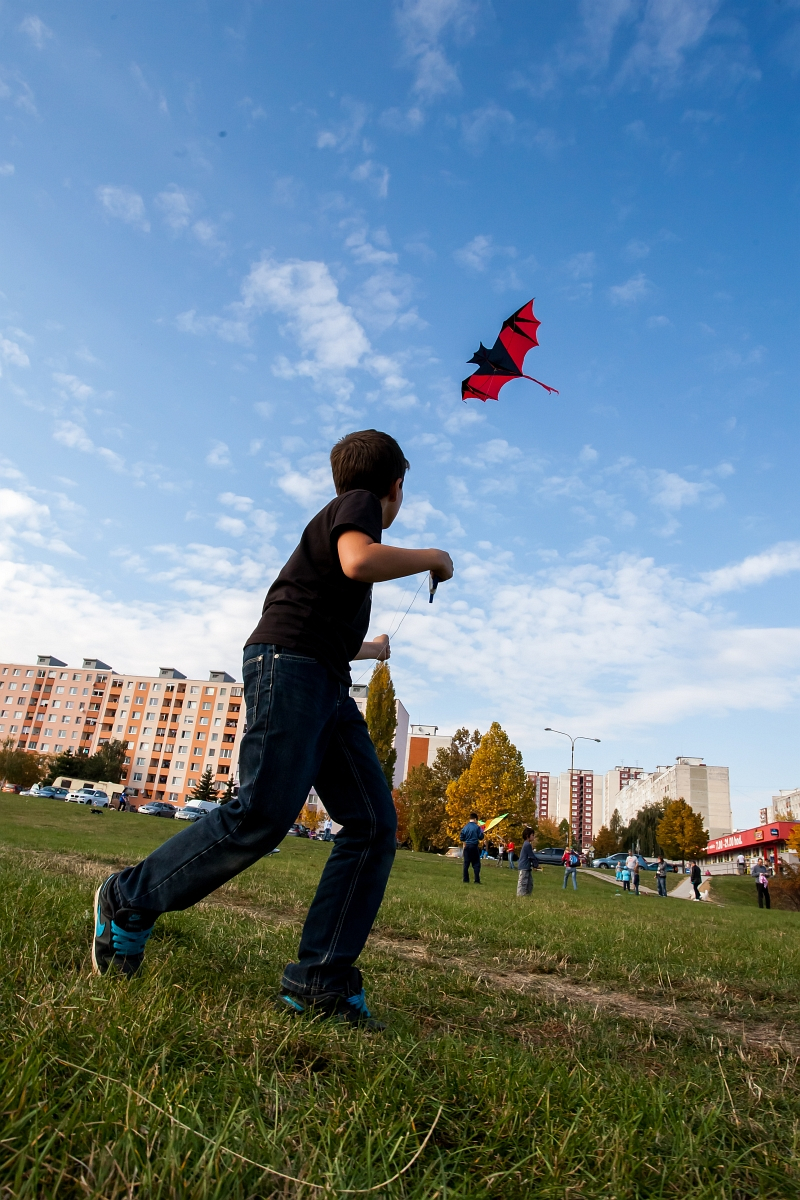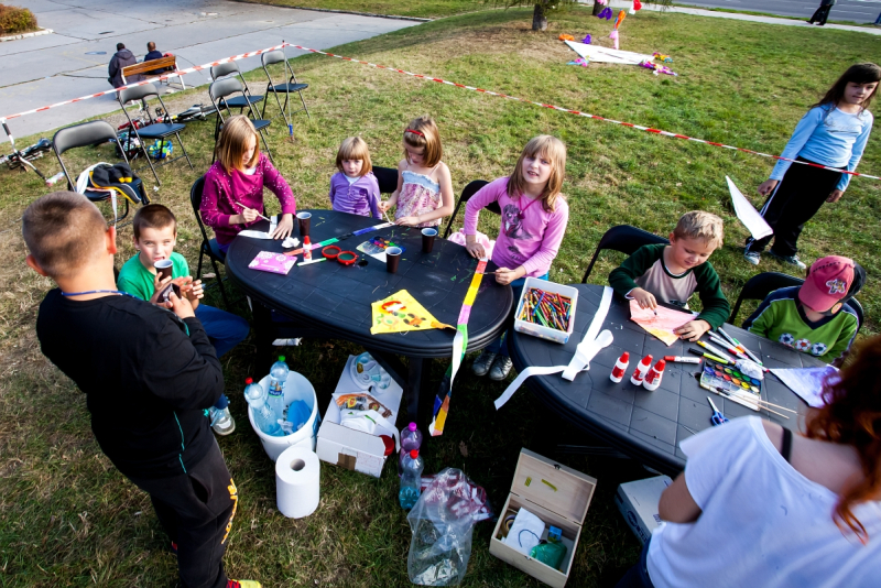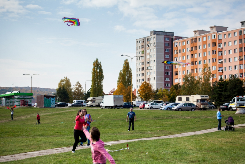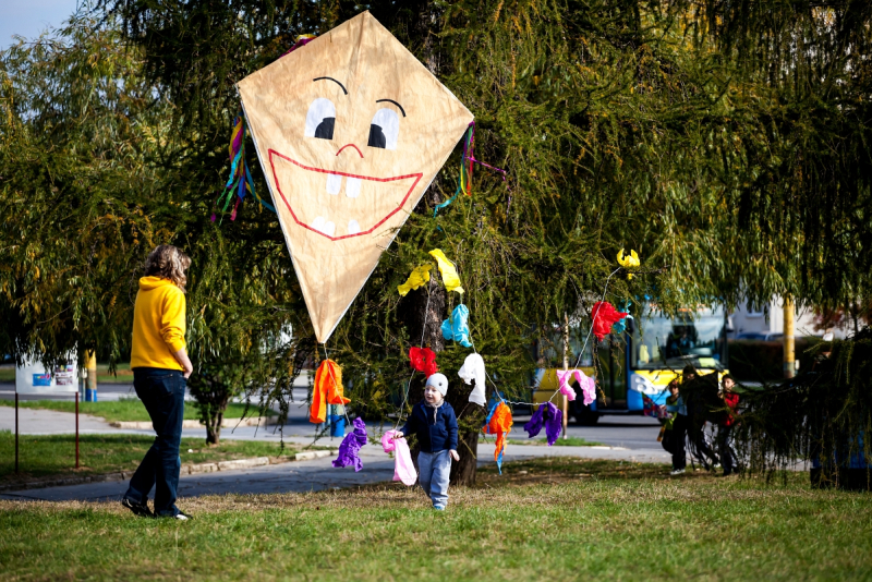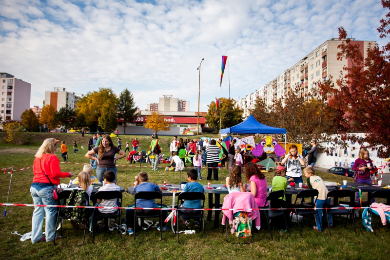 Deň bol nad očakávanie krásny- vôňa stromov, teplo a štebot vtákov skôr pripomínali prebúdzajúcu sa jar, než vládu jesene. Radostná atmosféra sa šírila pomedzi bytovky na otvorenom priestranstve, kde sme rozložili hudobný kútik, stoly na tvorivú dielňu i predajňu šarkanov a cukrovej vaty.