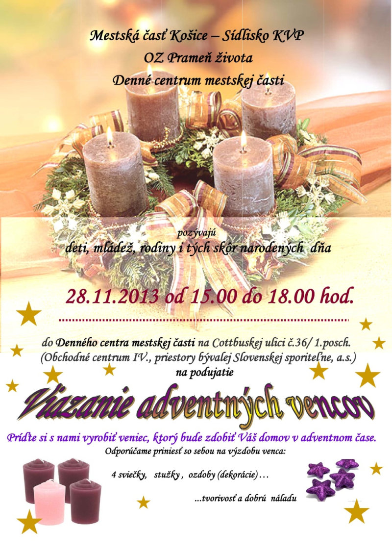deti, mládež, rodiny i tých skôr narodených dňa 28.11.2013 od 15.00 do 18.00 hod. do denného centra na Cottbuskej ulici č. 36 - 1.poschodie na podujatie Viazanie adventných vencov.