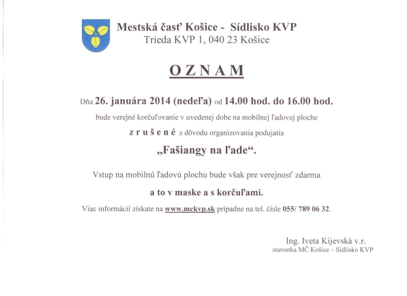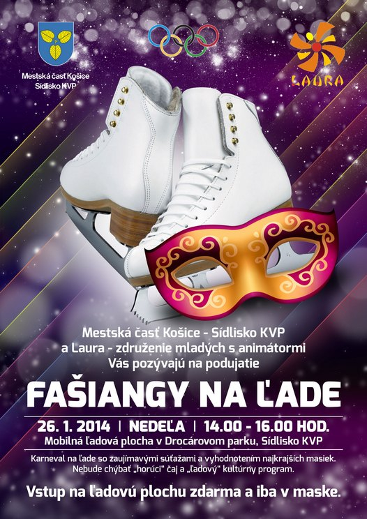 Mestská časť Košice - Sídlisko KVP a OZ Laura - združenie maldých opäť pre vás pripravujú Fašiangy na ľade, ktoré sa budú konať dňa 26.01.2014 (nedeľa) od 14:00 - 16:00 hod. na Mobilnej ľadovej ploche v Drocárovom parku.