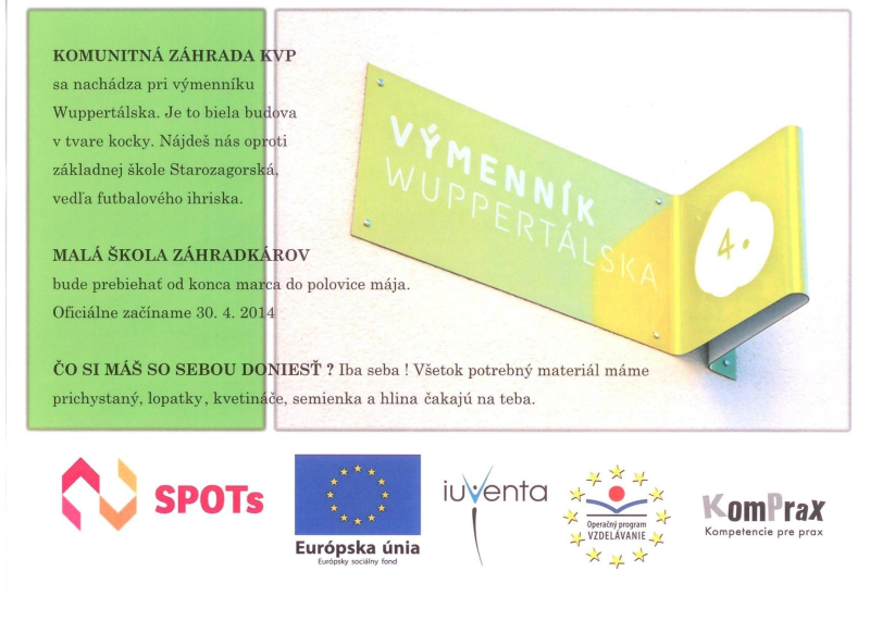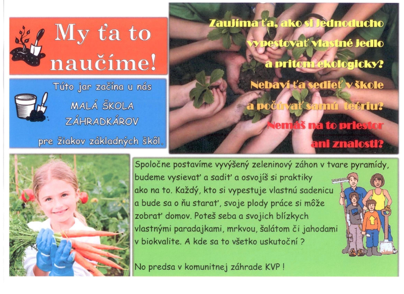 V komunitnej záhrade KVP sa spúšťa nový praktický projekt s podporou Iuventy. Podnetom ku realizácii je nezáujem žiakov o ekológiu, záhradkárčenie a o prírodu, absencia priestoru pre realizáciu a dopestovanie zeleniny. Takisto súčasný moderný štýl života láka kupovať potraviny a odrádza od ich pestovania. Projekt „Malá škola záhradkárov“ je určený pre žiakov základných škôl zo sídliska KVP.