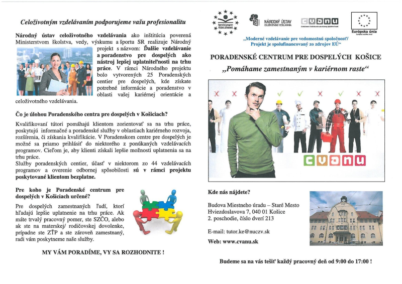 V Košiciach vzniklo Poradenské centrum pre dospelých v budove Miestneho úradu - Staré Mesto na Hviezdoslavovej ulici č.7. Každý pracovný deň od 9:00 do 17:00 hod. klientom poskytujú odborné poradenstvo tri tútorky „Kvalifikovaní poradcovia hodnotia vedomosti, zručnosti a spôsobilosti záujemcov, ktoré doposiaľ nadobudli praxou či formálnym vzdelávaním. Následne im navrhujú vhodné vzdelávacie programy či skúšky, ktorými by získali potrebnú odbornú spôsobilosť,“ informuje o práci poradenských centier riaditeľka Národného ústavu celoživotného vzdelávania, Zuzana Štrbíková.