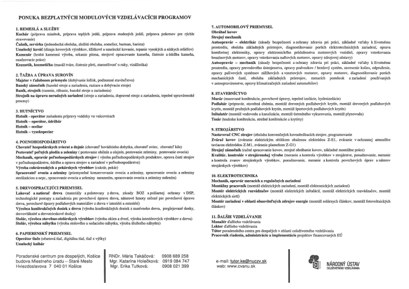 Najlepším nástrojom zamestnateľnosti je dôsledná pripravenosť na pracovný trh. K tomu prirodzene patrí aj dostatočné vzdelanie a odborná kvalifikácia. V rámci národného projektu je preto klientom ponúkaných 44 bezplatných modulových vzdelávacích programov. „Medzi najžiadanejšie profesie patrí kuchár, čašník, kozmetička, cukrár, popr. murár, nastavovač CNC strojov či zvárač kovov. Zaujímavým spestrením pre klientov sú často vzdelávacie kurzy ako napríklad umelecký kováč a umelecký knihár. Vzhľadom na rozvoj malých fariem na východnom Slovensku sa dostávajú do popredia aj pestovateľ poľných plodín a zeleniny a chovateľ hospodárskych zvierat,“ povedala tútorka Poradenského centra pre dospelých v Košiciach, Erika Tutková.