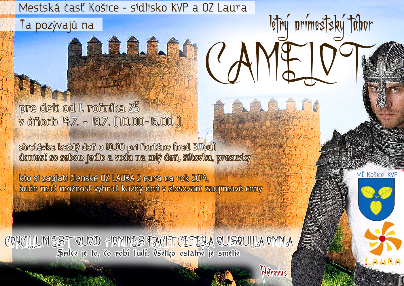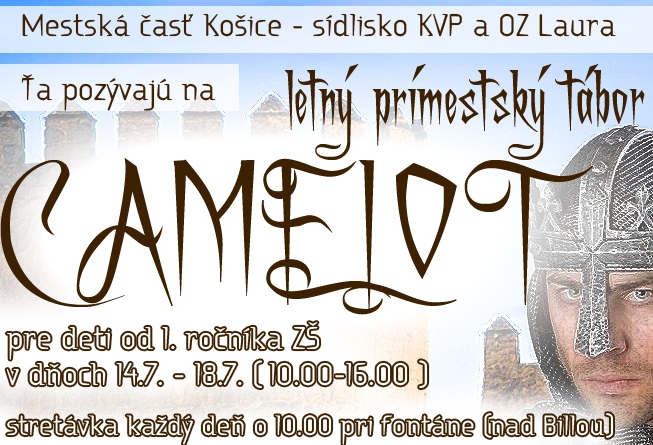 Mestská časť Košice – Sídlisko KVP a OZ Laura pozývajú deti v školskom veku (od 1. ročníka ZŠ) na letný prímestský tábor v dňoch 14. – 18. júla 2014 (10.00 - 16.00 hod.). Stretnutie každý deň o 10.00 hod. pri fontáne (nad Billou). Doneste si so sebou jedlo, vodu, šiltovku a prezúvky.