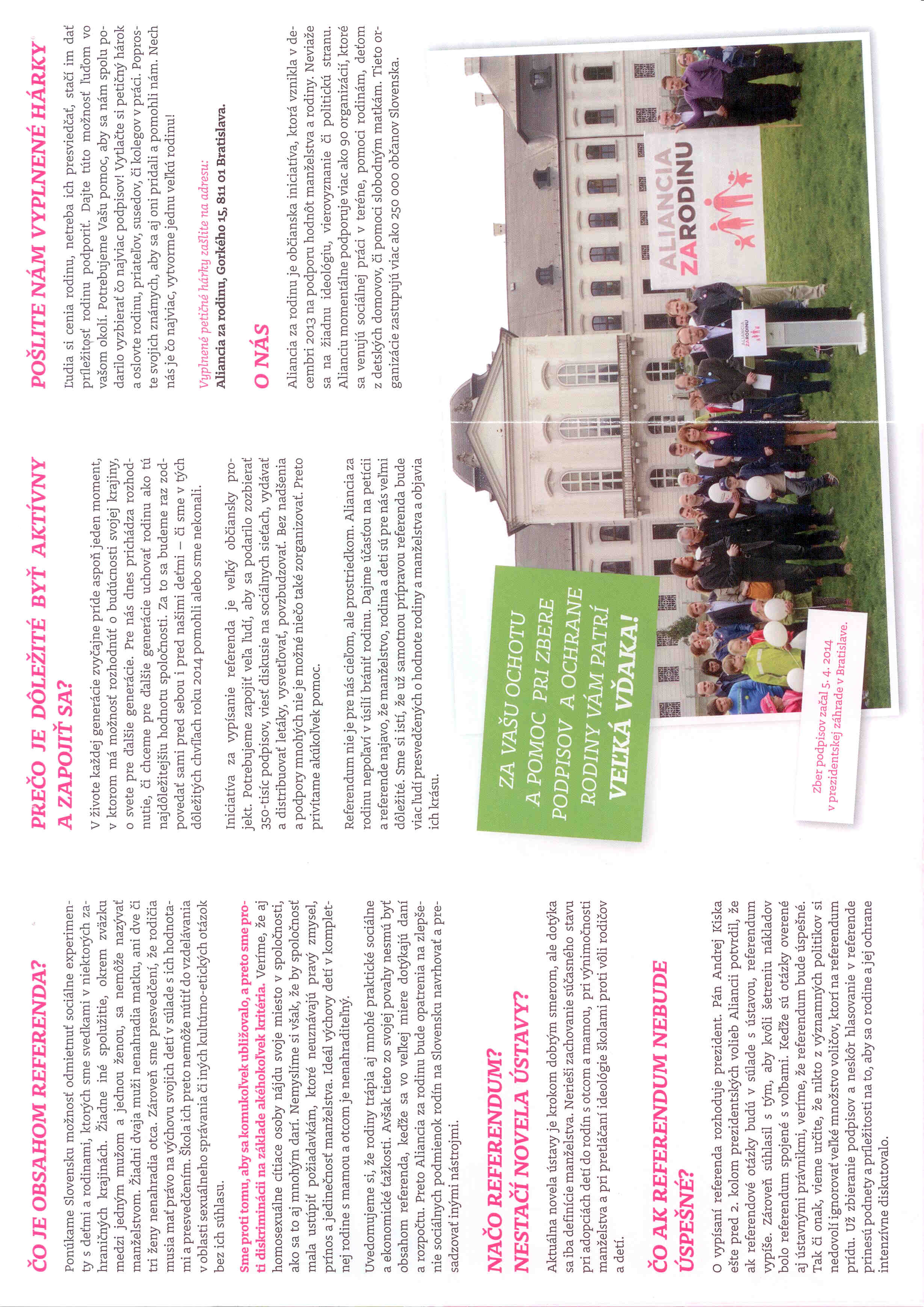 Dňa 5. apríla 2014 začala občianska iniciatíva Aliancia za rodinu zber podpisov pod petíciu REFERENDUM O OCHRANE RODINY. Doteraz podporilo petíciu 200 000 občanov a denne pribúdajú ďalší. Iniciatívu podporuje už takmer 100 mimovládnych organizácií i viaceré kresťanské cirkvi. Viac o tomto zámere sa dočítate v letáku.