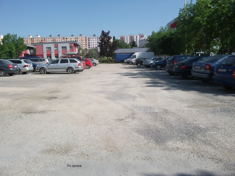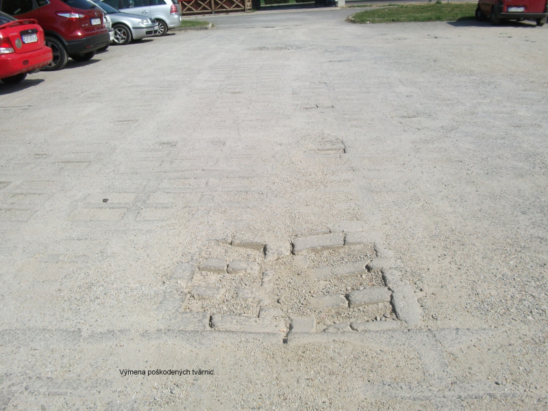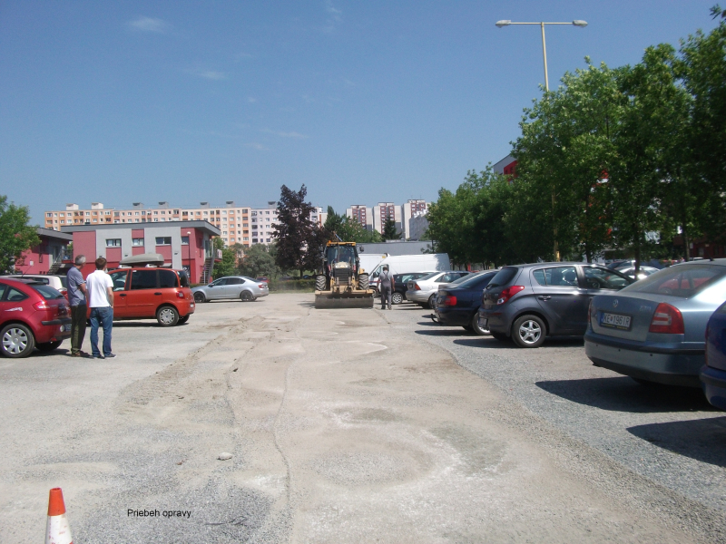 Za účelom vyrovnania nerovností sme dňa 8.6.2015 zabezpečili vyrovnanie časti parkoviska zo západnej strany (prejazd cez parkovisko) ťažkým mechanizmom. Aj táto oprava je len dočasná s tým,že stav parkoviska budeme sledovať. Nerovnosti parkoviska z východnej strany budeme riešiť výmenou poškodených a prepadnutých polovegetačných tvárnic.
